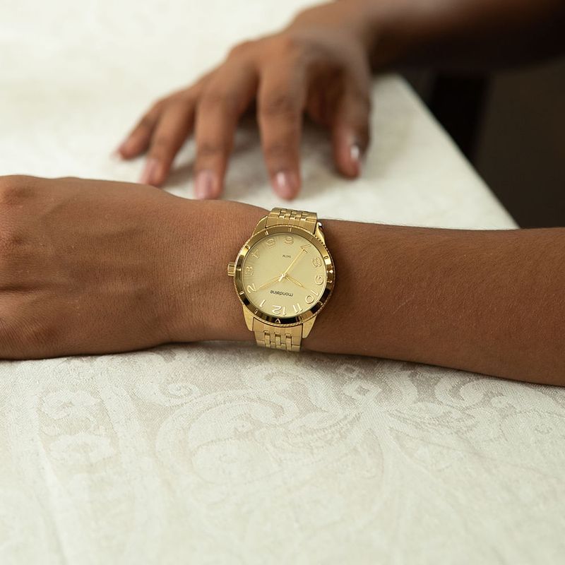 Este kit combina o brilho do dourado com a elegância da textura metálica no mostrador.