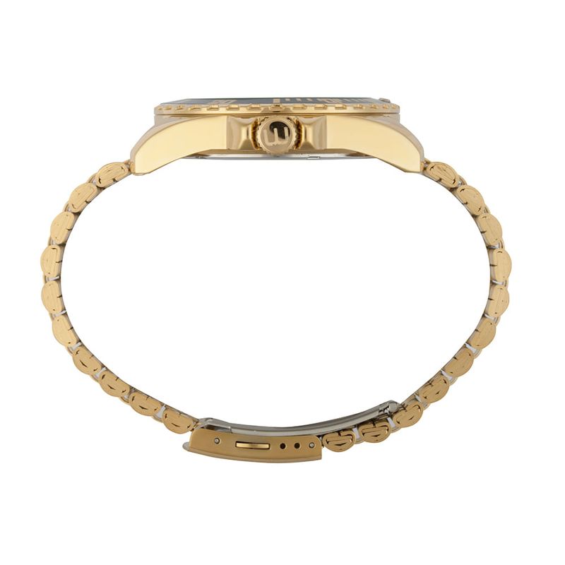 A pulseira de aço dourado complementa o visual e oferece alta durabilidade. O fecho em aço garante um ajuste seguro e confortável no pulso. Este modelo robusto possui fundo de rosca e resistência à água de 5 ATM, sendo ideal para o cotidiano.