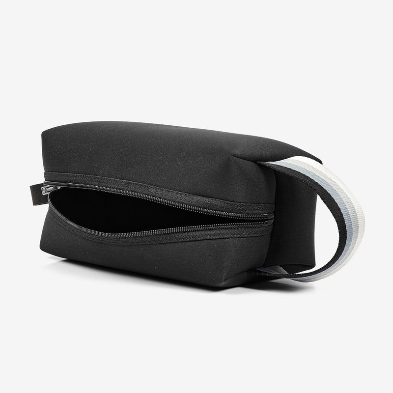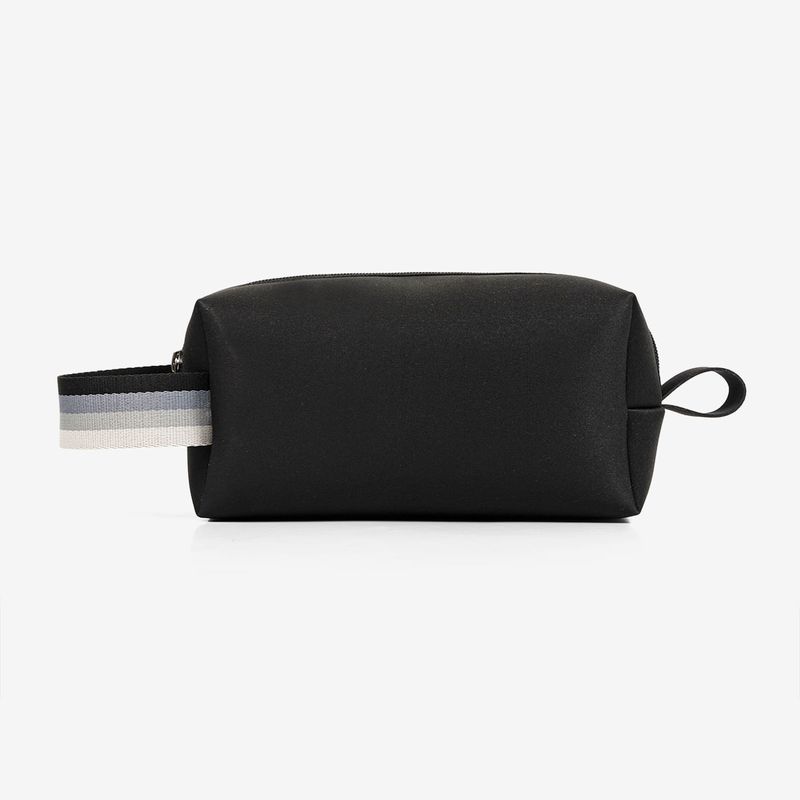 Necessaire confeccionada em tecido vancouver, na cor preta. Possui alça para manuseio em gorgorão e fechamento em zíper na parte superior.