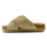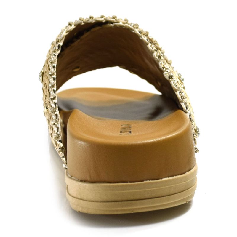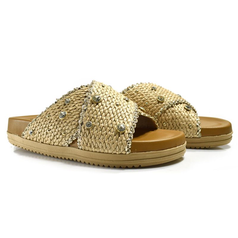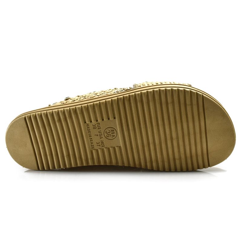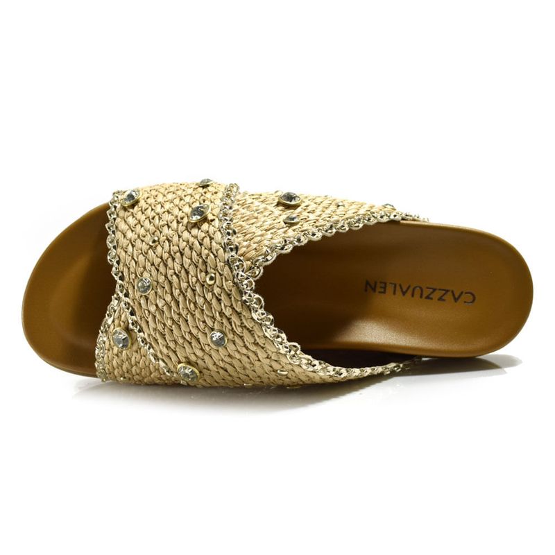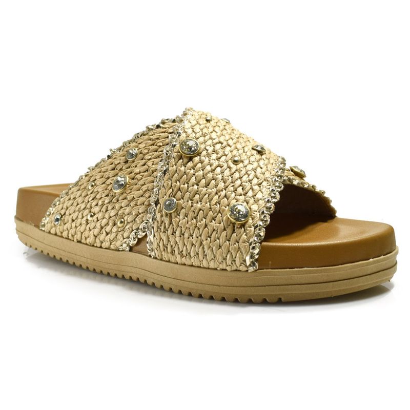 A Papete Feminina Cazzualen é a combinação perfeita entre o conforto indispensável do dia a dia e o glamour do acabamento artesanal. Este modelo é o item-chave para elevar seus looks de verão, passeios de fim de semana ou momentos de lazer com um toque sofisticado e único. O destaque principal é o seu cabedal largo, confeccionado em palha sintética, que remete à leveza da estação. Para conferir um toque de glamour, o cabedal é adornado com uma rica aplicação de pedrarias e elementos metálicos mini-tachas metálicas e uma delicada corrente prateada delineiam as bordas, adicionando brilho e sofisticação. O design é finalizado com um solado plataforma robusto e confortável, em tom caramelo, que oferece excelente amortecimento e estabilidade. Ref:40177/100