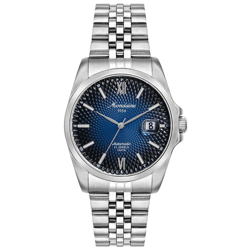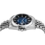 Este relógio automático apresenta uma caixa de 40mm e pulseira, ambos em aço inoxidável. O mostrador azul é protegido por um vidro de cristal mineral e possui marcação com números romanos e index.