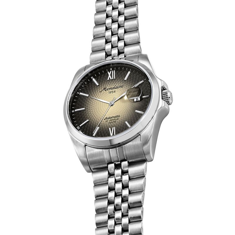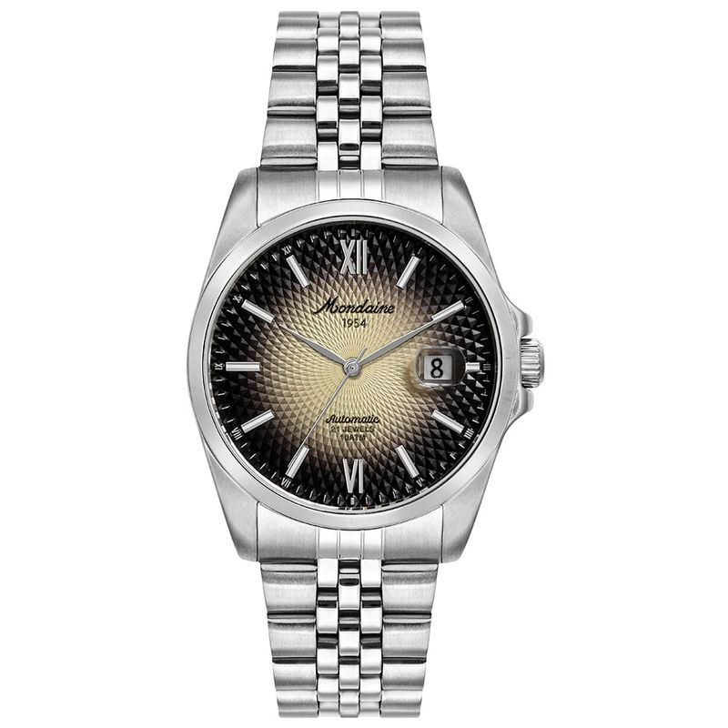 Este relógio automático possui caixa de 40mm e pulseira, ambas em aço inoxidável. O mostrador é preto, protegido por vidro de cristal mineral, e apresenta marcação com números romanos e index.