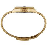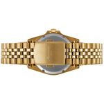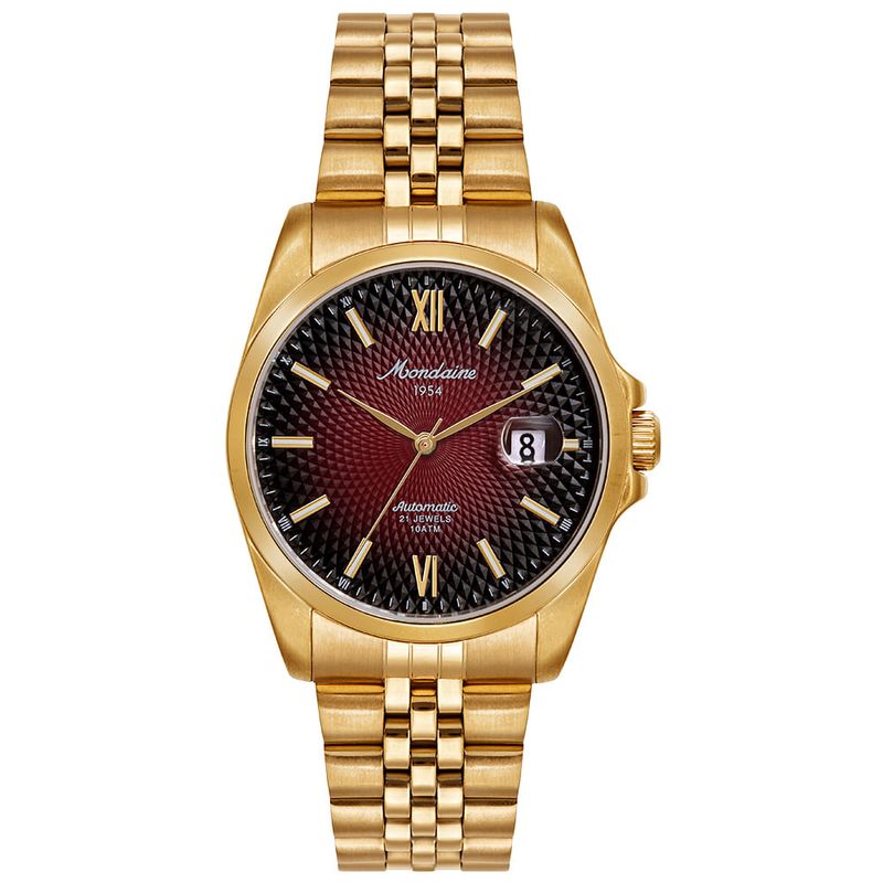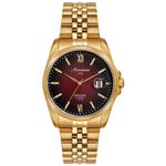 Este relógio automático apresenta caixa de aço de 40mm e pulseira de aço, ambas com acabamento dourado. O mostrador é vermelho, com vidro de cristal mineral e marcação com números romanos e index.