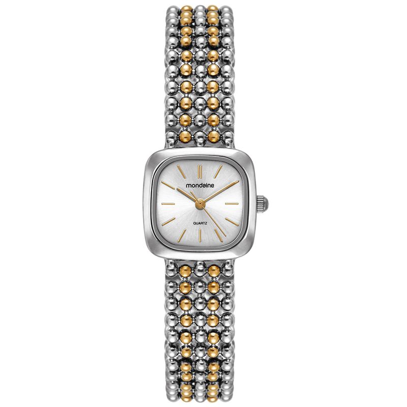 É um acessório versátil que une a modernidade do formato quadrado com o classicismo do bicolor. Perfeito para mulheres que buscam uma peça refinada, capaz de complementar tanto looks casuais quanto formais. Um Mondaine que adiciona um toque de brilho e elegância.
