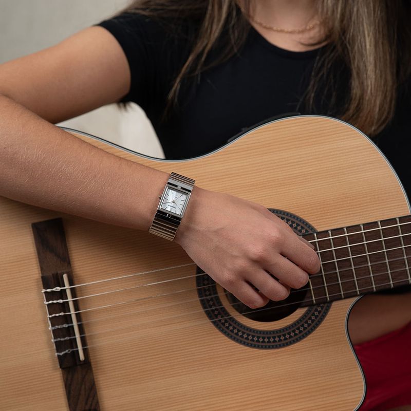 O relógio analógico sofisticado apresenta uma pulseira de expansão em metal estilo bracelete, proporcionando conforto e adaptação a todos os tamanhos de pulso. Seu mostrador em madrepérola branca com ponteiros em filetes adiciona elegância ao design. Possui folheação prata e uma caixa de metal com 2,2 cm de diâmetro, destacando-se pela sua delicadeza e estilo refinado. Este relógio é ideal para complementar qualquer look com sofisticação e funcionalidade.