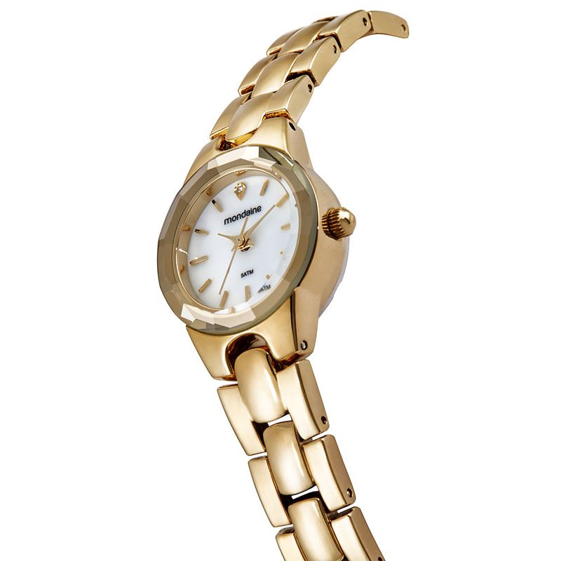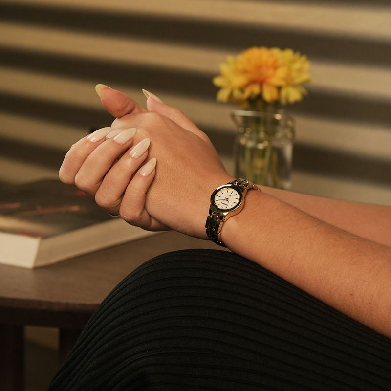 A caixa pequena de 22mm em tom dourado traz leveza e charme, perfeita para pulsos mais finos.