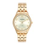 A pulseira de aço dourado é robusta, durável e confere um brilho sofisticado ao acessório. O fecho em aço garante segurança no pulso. Este relógio é ideal para o dia a dia, com alta resistência de 5 ATM e fundo de rosca para maior proteção.