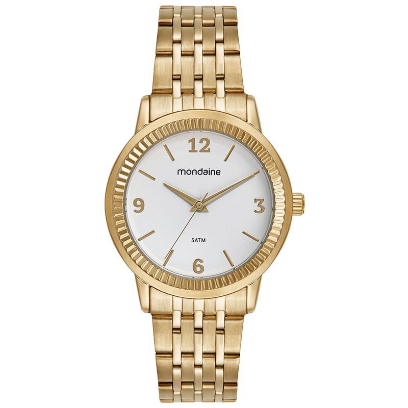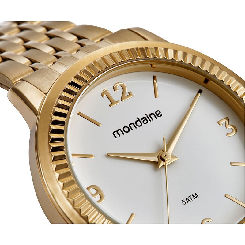 O relógio feminino Mondaine entrega um visual sofisticado com personalidade marcante. Sua pulseira dourada em aço com sete elos proporciona conforto e elegância ao pulso.