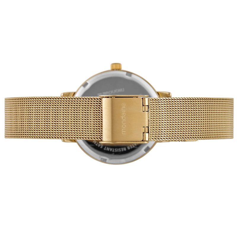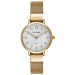 Com estilo clássico e acabamento elegante, este relógio feminino Mondaine apresenta pulseira em malha de aço dourada.