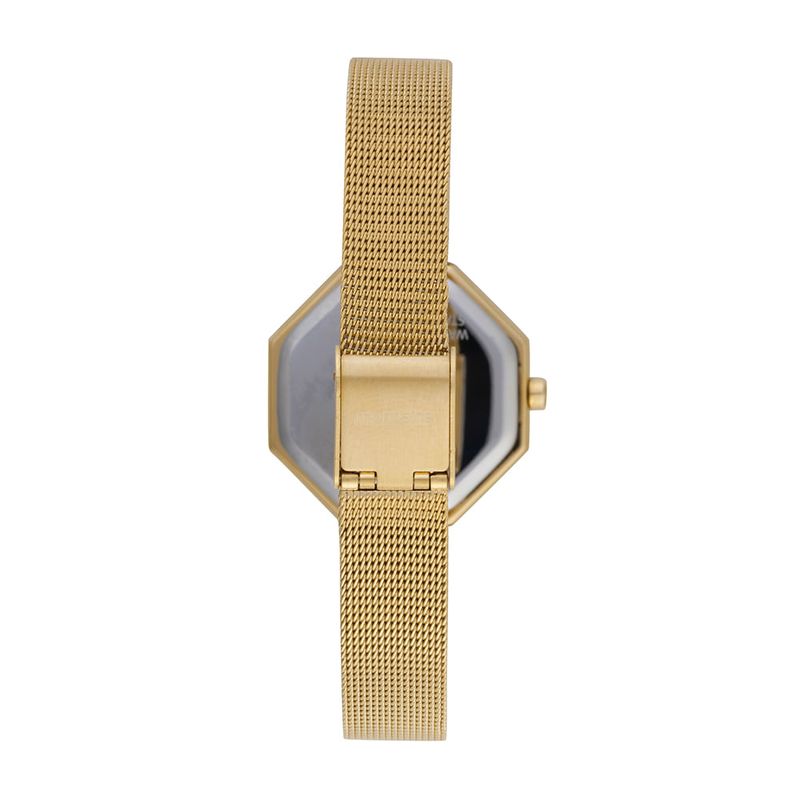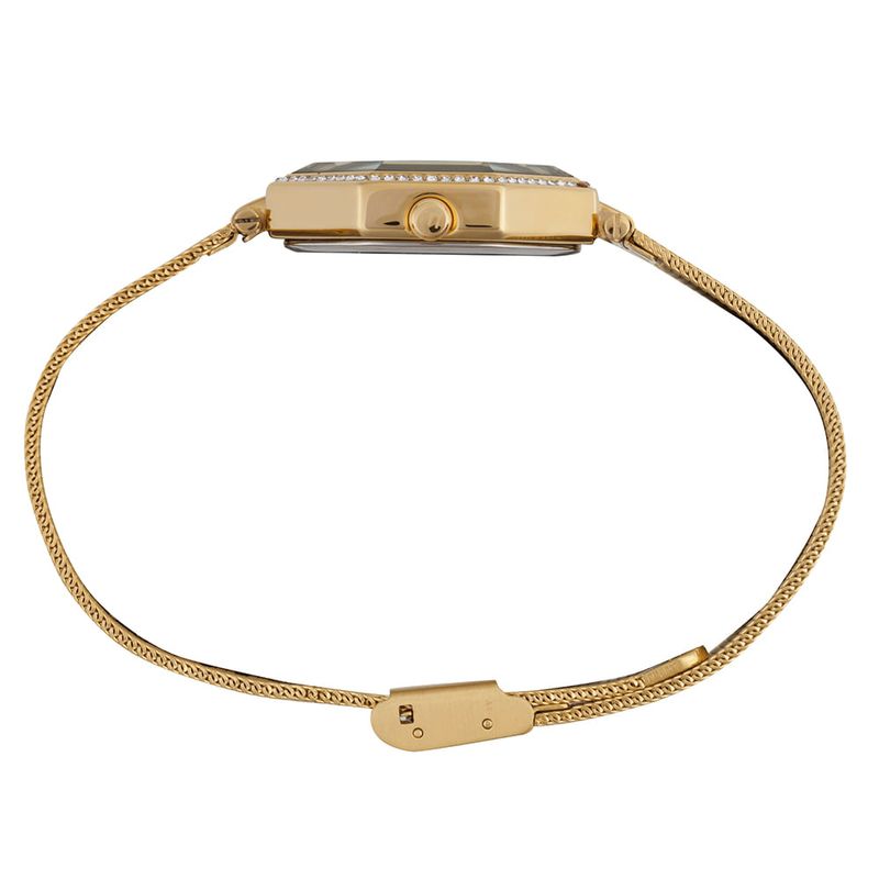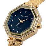 Este elegante relógio feminino apresenta uma caixa octogonal dourada, com cristais cravejados que adicionam um toque de sofisticação ao design. O mostrador azul é realçado por cristais na marcação, oferecendo um visual delicado e refinado. A pulseira em malha de aço dourada confere ao modelo um ajuste confortável e elegante, perfeito para quem busca um relógio versátil para todas as ocasiões.