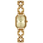 O design "all golden" é completado pela pulseira de metal dourado, que garante durabilidade e um visual luxuoso. O fecho em aço oferece um ajuste prático e seguro para o uso diário. Este modelo possui fundo de pressão e resistência à água de 3 ATM, protegendo contra respingos.
