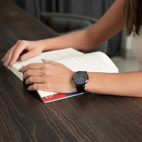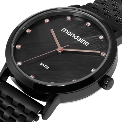 Este relógio de pulso analógico preto apresenta um mostrador com efeito de madrepérola, que confere um brilho sutil e sofisticado. Os marcadores em cristais e os ponteiros em filetes garantem uma leitura elegante e precisa das horas. A caixa em metal, com 3,6 cm de diâmetro, oferece um ótimo caimento no pulso. A pulseira, trabalhada em gomos, é equipada com um fecho de acionamento lateral para segurança e praticidade. Ideal para quem busca um design refinado e moderno.