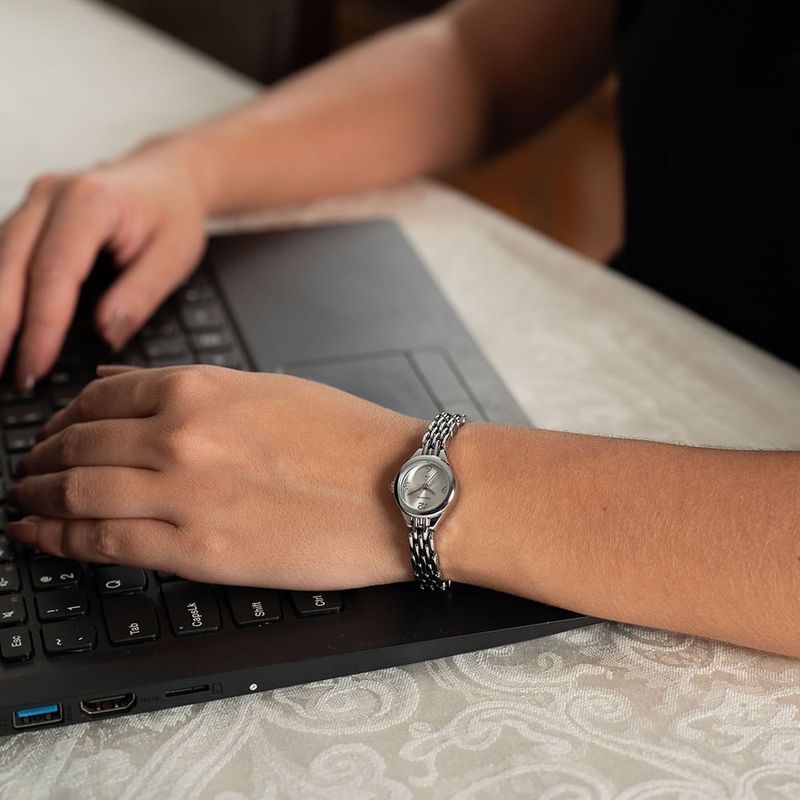 Este relógio delicado estilo joalheria, com caixa pequena de 19mm de diâmetro, proporciona um ajuste perfeito ao pulso. Sua pulseira fina e sólida, junto ao fecho joalheria, garante praticidade e segurança, enquanto o mostrador com efeito metálico adiciona um toque de sofisticação. Ideal para ocasiões especiais, este modelo é a escolha perfeita para quem busca um acessório elegante e refinado.