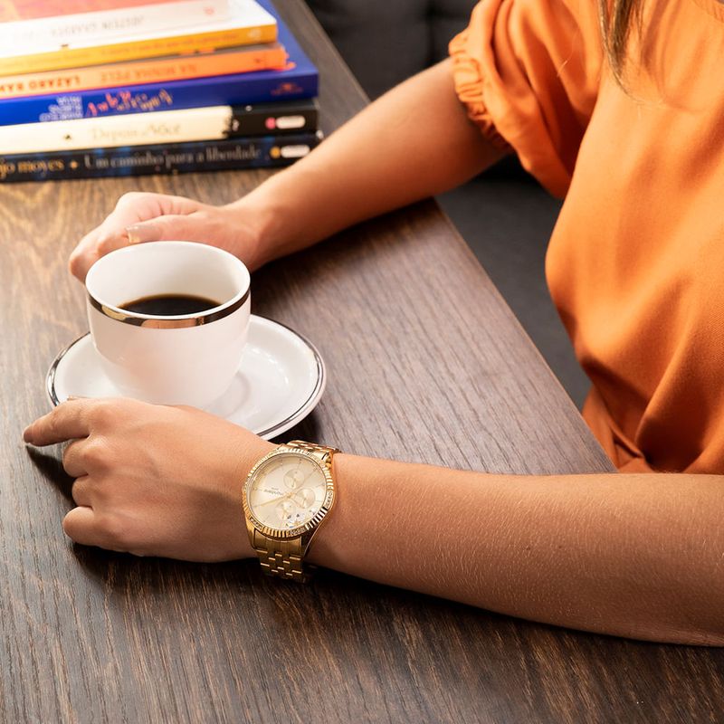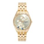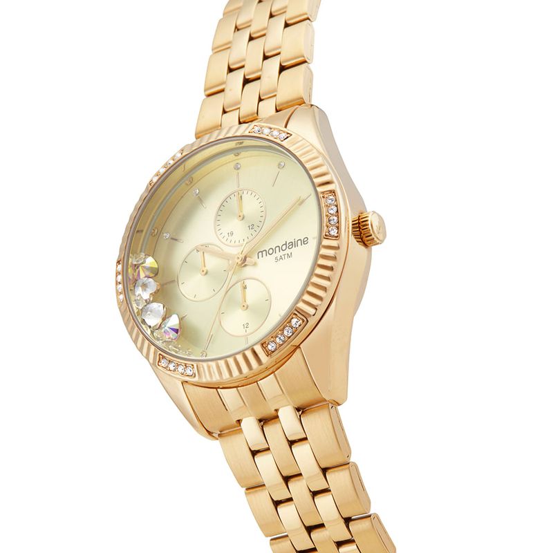 Este relógio multifunção possui o design de uma verdadeira joia. Tem pedras nos marcadores e na caixa, e corações e cristais soltos no mostrador dando charme para o modelo. Sua pulseira em aço possui fecho de acionamento lateral conferindo praticidade e ótimo ajuste ao pulso. É o relógio perfeito para ocasiões mais sofisticadas. Esse relógio possui a caixa em 4 cm de tamanho.