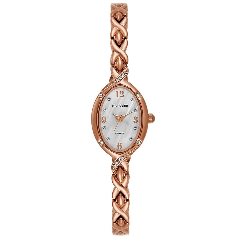 Este relógio Feminino Mondaine encanta pelo seu acabamento monocromático em Rose Gold. A caixa de metal possui um delicado formato oval de 20mm. O mostrador analógico branco oferece um contraste limpo e elegante, com marcação completa de números e indexes.