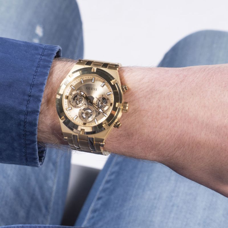 Relógio multifuncional masculino Guess em tom dourado, onde o estilo encontra a funcionalidade. Este modelo apresenta um design multifuncional com estilo crono, além de detalhes nos submostradores que mostram o movimento do relógio, criando um visual dinâmico e moderno. Todo em aço, com caixa de 4,4 cm de diâmetro, oferece um ótimo caimento no pulso, garantindo conforto e sofisticação para o seu dia a dia.