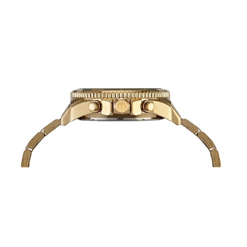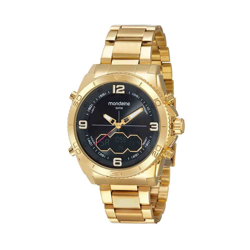 Com alarme, cronógrafo e luz interna, este relógio contém visor preto e caixa de metal dourado com função anadigi. A pulseira trabalhada em aço dourado, possui fecho por fivela. Esse relógio possui a caixa em 4 cm de tamanho.