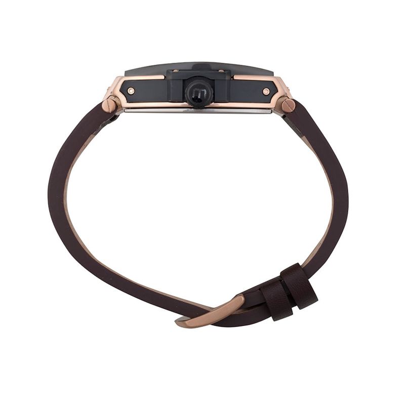 A pulseira em couro legítimo marrom oferece conforto excepcional e um acabamento sofisticado, ajustando-se perfeitamente ao pulso com sua fivela. O fundo parafusado do relógio confere maior proteção ao maquinário interno. A combinação de tons terrosos resulta em um acessório cheio de personalidade.