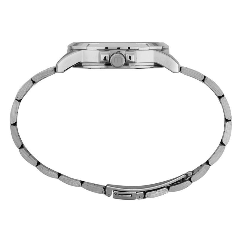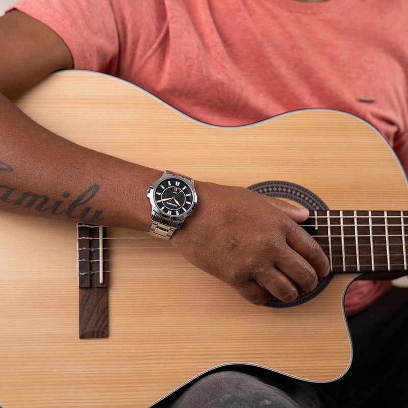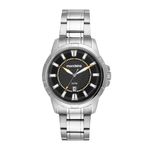 Este relógio de pulso analógico casual oferece uma combinação de estilo e funcionalidade. Com um mostrador preto texturizado e marcadores geométricos de fácil visualização, além de um calendário integrado, ele exibe folheação prata. A caixa em metal, com 4,4 cm de diâmetro, proporciona um ajuste confortável e robusto. O modelo clássico conta com uma pulseira de aço, trabalhada com acabamento escovado e polido e frisos entremeio, e um fecho de acionamento lateral, garantindo segurança e um ajuste perfeito. Ideal para quem valoriza um design atemporal e uma estética refinada.