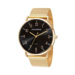 Versátil e resistente, este relógio analógico com calendário e numeração completa é a escolha ideal para o uso diário. A combinação de cores preto e dourado confere um visual moderno e sofisticado, perfeito para qualquer ocasião. Sua pulseira, que apresenta fechamento por trava de segurança, garantia de resistência e durabilidade ao acessório. Com uma caixa de 4,8 cm, este relógio tem estilo e funcionalidade, tornando-se um item indispensável no seu dia a dia.