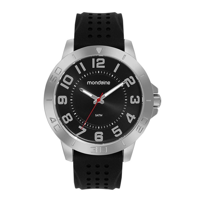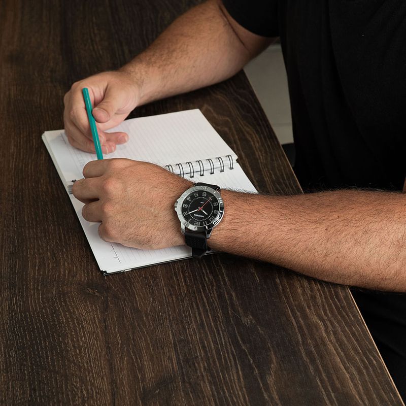 Este relógio analógico casual destaca-se pelo mostrador preto com numeração completa de fácil leitura. A caixa cromada em metal de 4,8 cm de diâmetro, com marcações na catraca, proporciona resistência e um visual robusto ao relógio. A pulseira de silicone, com detalhes em furos, é macia e de fácil ajuste, proporcionando conforto durante o uso. Este acessório se adapta bem a todos os tamanhos de pulso, oferecendo um ajuste perfeito, especialmente para pulsos médios e maiores.