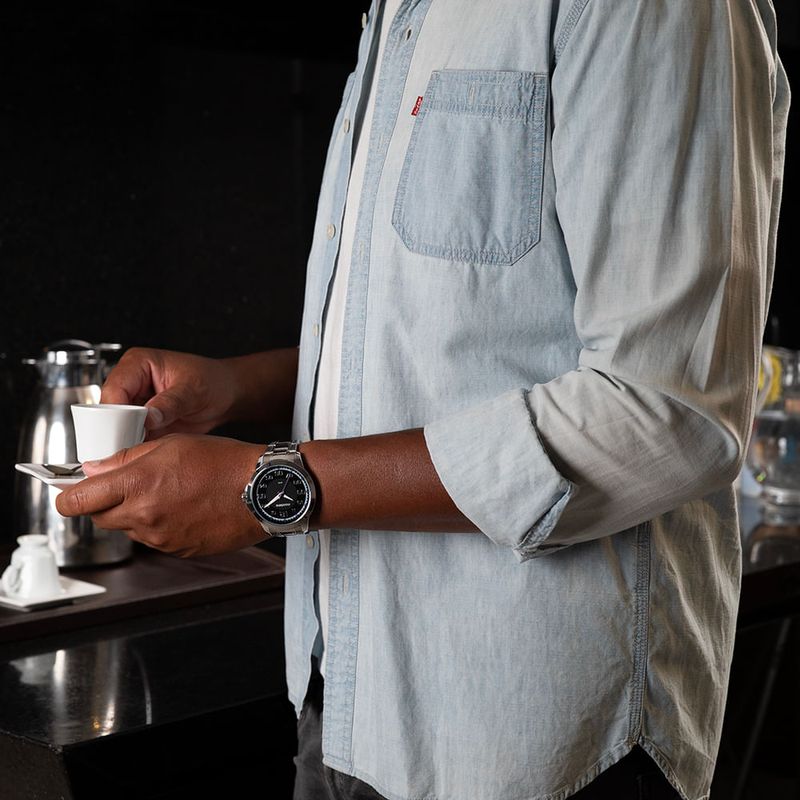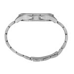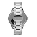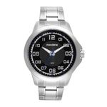 Relógio com design contemporâneo com folheação prata, possui caixa em metal robusta que veste bem pulsos maiores e médios. Apresenta um mostrador preto com efeito texturizado e numeração completa, tornando a leitura das horas rápida e fácil. A pulseira em aço escovado e polido oferece ajuste de tamanho e fecho dobrável. Com uma caixa de 4,8 cm de tamanho, este relógio é uma escolha sofisticada para quem busca um acessório versátil e elegante.