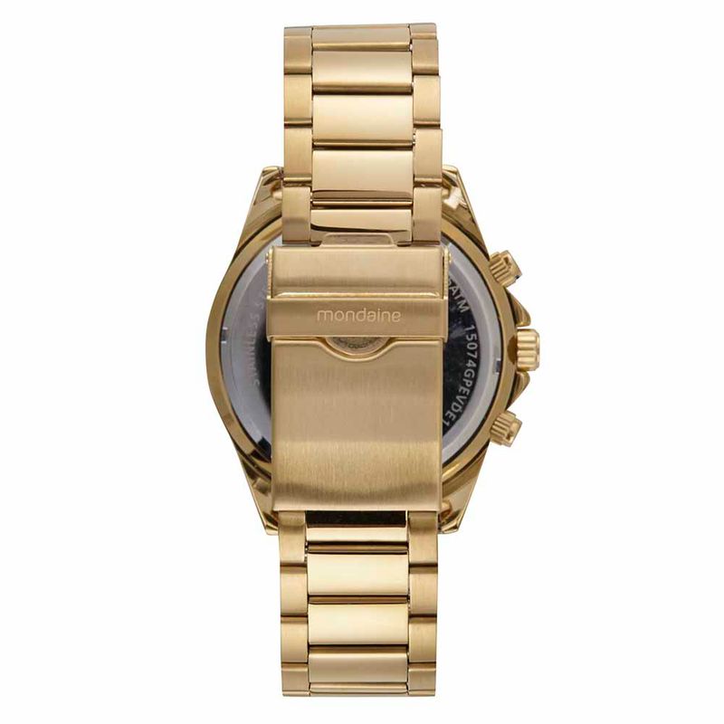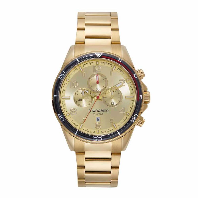 Versátil e funcional, este relógio cronógrafo é perfeito para o dia a dia. Possui caixa em metal, numeração completa, calendário e marcações na catraca. A catraca preta com detalhes em vermelho traz contraste com a folheação dourada. Sua pulseira é em aço escovado e polido com fecho de trava de segurança, ideal para pulsos maiores e médios. Esse relógio possui a caixa com 4,8 cm de tamanho.