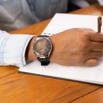 O mostrador preto, com marcadores numéricos e indexes combinados, traz profundidade e excelente leitura, destacando as subfunções do cronógrafo.