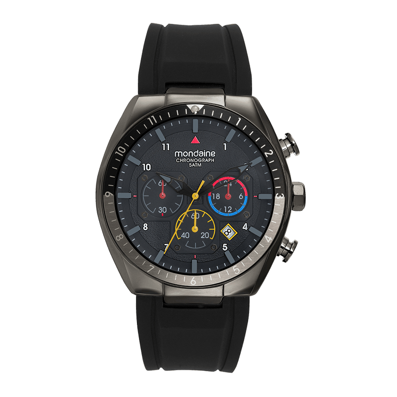 Robustez e estilo esportivo se unem neste relógio cronógrafo da Mondaine, ideal para quem busca um acessório imponente e funcional.