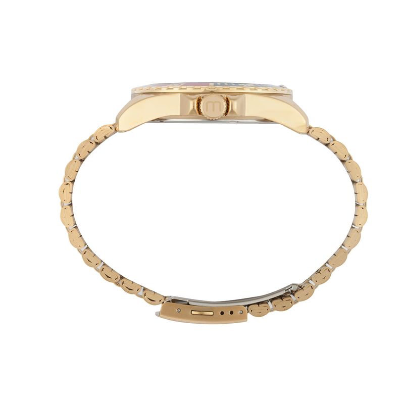 A pulseira de aço dourado completa o visual luxuoso, oferecendo alta durabilidade. O fecho em aço proporciona um ajuste seguro e firme no pulso. Este relógio é muito resistente, com 5 ATM de proteção à água e fundo de rosca para vedação superior.