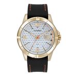 Com caixa de 48 mm em metal com acabamento dourado e mostrador prata, este relógio masculino combina estilo e praticidade em um design moderno. O mostrador claro é realçado por numerais e índices completos, garantindo leitura precisa. A função calendário com janela de data às 3 horas e as marcações duplas de horário oferecem uma experiência completa para quem busca máxima funcionalidade.