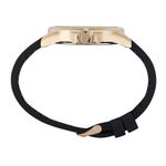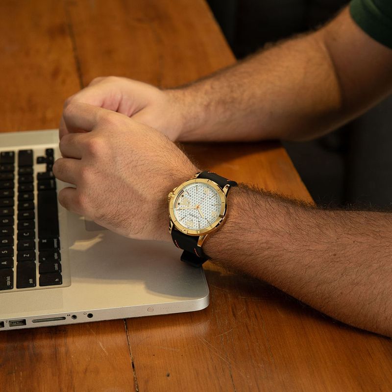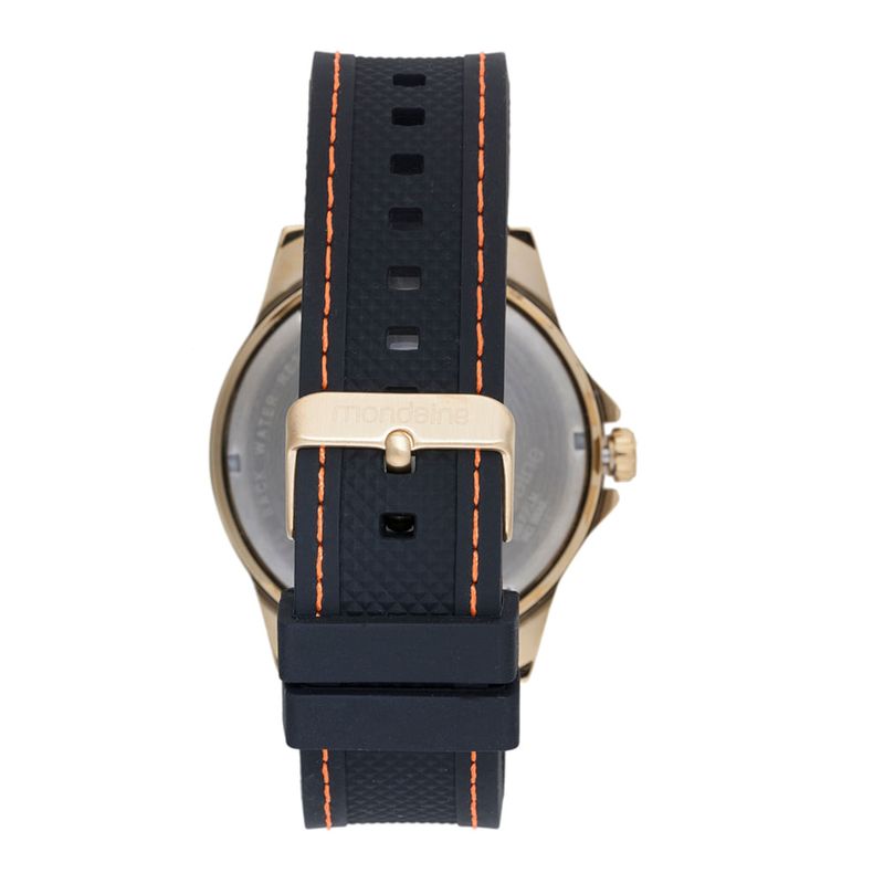A pulseira em silicone preto mantém o conforto e a durabilidade, ajustando-se facilmente ao pulso. Com resistência à água de 5 ATM