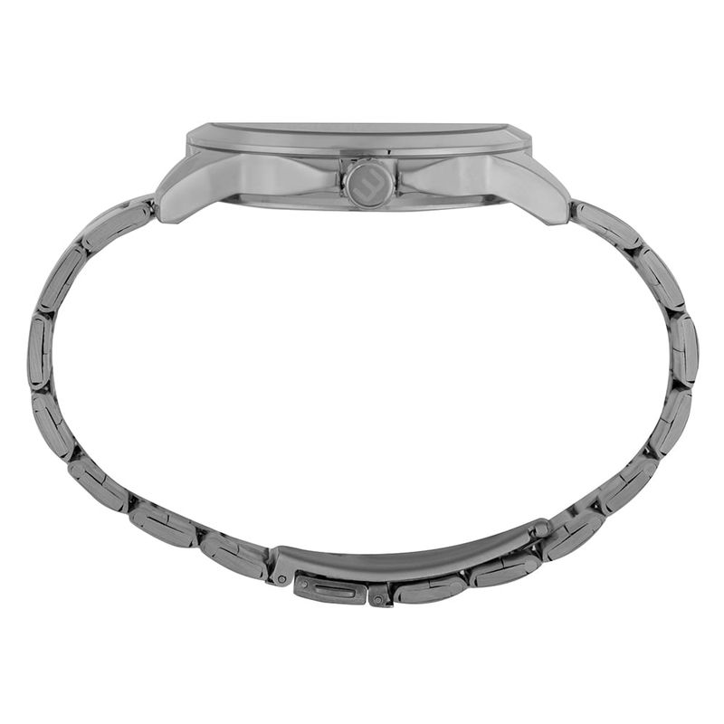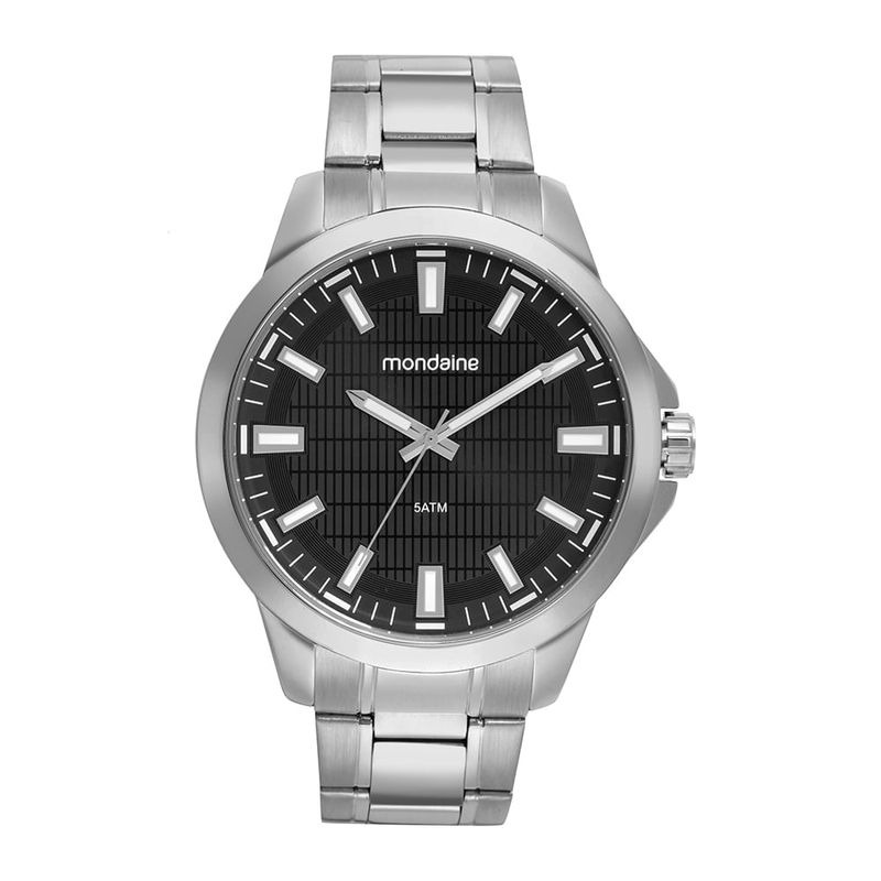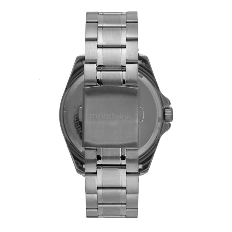 A pulseira em aço prata com acionamento lateral complementa o design . Sua estrutura é reforçada com fundo rosqueado e resistência à água de 5 ATM, tornando-o um bom aliado para o dia a dia.