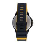Este relógio masculino combina design esportivo com caixa metálica robusta de 47mm em preto e laranja.