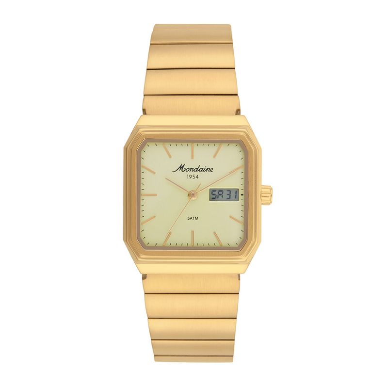 A Linha 1954 da Mondaine reafirma a tradição da marca em unir design elegante e tecnologia moderna. O modelo Dourado destaca-se pela caixa em aço quadrada de 30x35mm e mostrador champagne, que traduzem sofisticação e exclusividade. A combinação entre o analógico e o digital oferece funcionalidade completa, mantendo a estética refinada que caracteriza esta coleção.