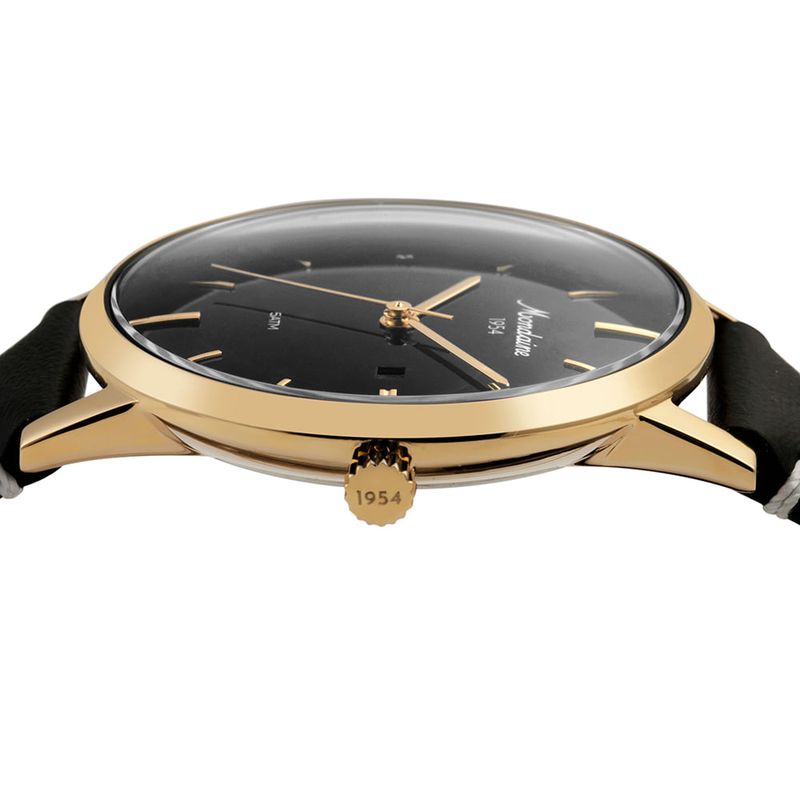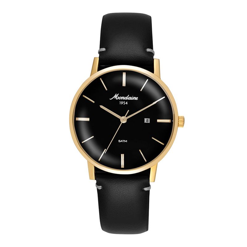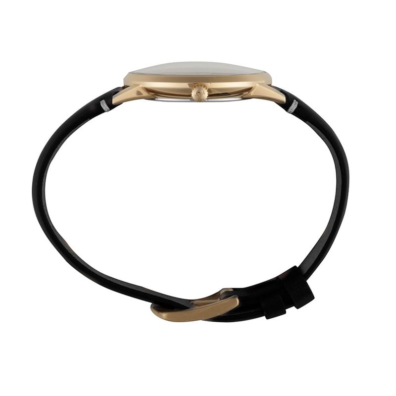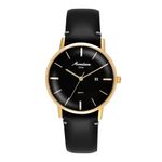 Relógio clássico e elegante, combina caixa em aço dourado com mostrador preto e pulseira de couro legítimo na mesma tonalidade.