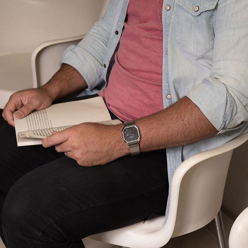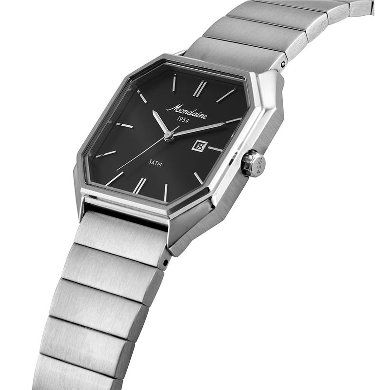 Relógio analógico quadrado cromado da exclusiva Coleção 70 Anos, modelo da nova linha premium Mondaine 1954. Com calendário e marcação completa, este modelo é todo em aço e apresenta uma pulseira sólida, oferecendo durabilidade e conforto. O mostrador é destacado com o logo vintage da Mondaine, um tributo à história e ao legado da marca. Este relógio se adapta perfeitamente a todos os tamanhos de pulso, tornando-se uma escolha ideal para quem busca elegância, funcionalidade e um toque de nostalgia