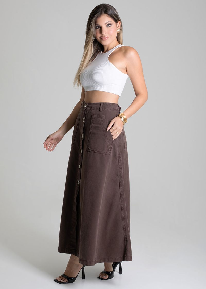 Saia confeccionada em sarja. O comprimento é midi e o caimento é solto. Cintura média Fechamento com botões Bolsos frontais e posteriores funcionais Barra simples Modelagem: Longa Tecido: Sarja Tipo de lavagem: Color Cor: morrom