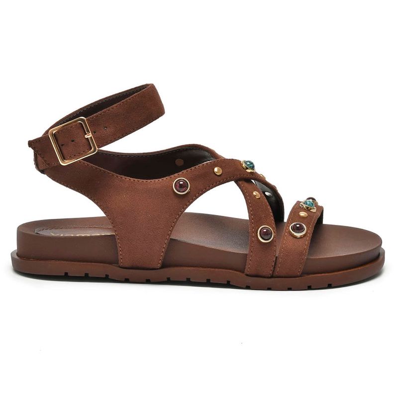 Sandália Flat Feminina Via Marte, confeccionada em material sintético, aplicações no cabedal, palmilha em EVA e solado de borracha. Essa sandália é moderna, confortável e despojada. Ideal para compor looks boho-chic com personalidade e estilo. Coleção: Primavera/Verão 2026. Aproveite e compre online. Ref: 174-016-01.