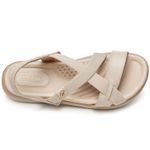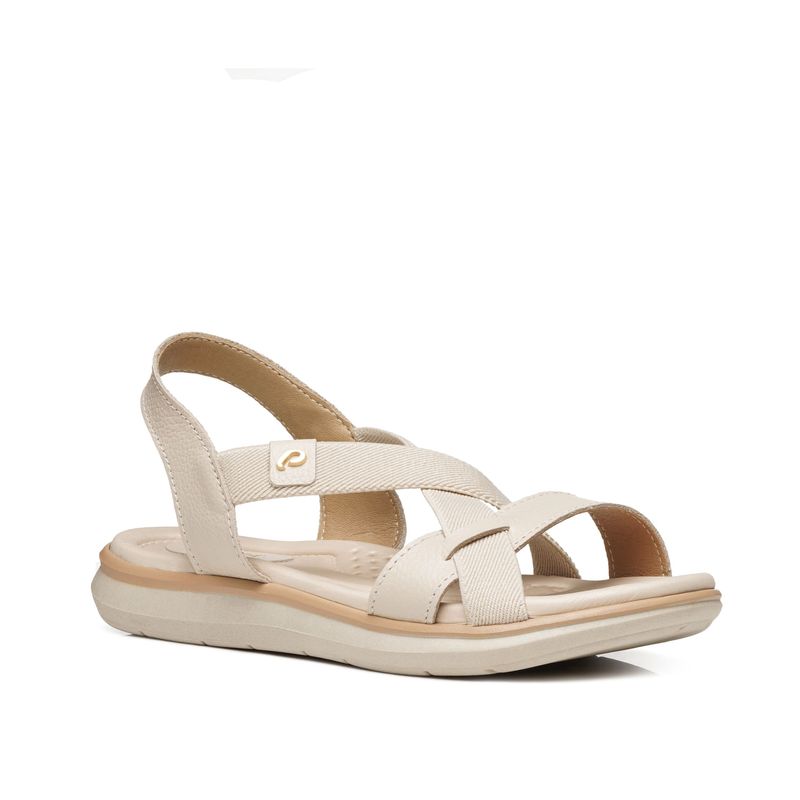 Essa sandália é feita em couro off white e tecido elástico, materiais que abraçam o pé e a deixam muito confortável. A palmilha é super macia e e de alto conforto também. Já o solado é leve e flexível e conta com a nossa Tecnologia de conforto AMORTECH, através de um amortecedor na região do calcanhar, material macio que garante menos impactos na pisada.
