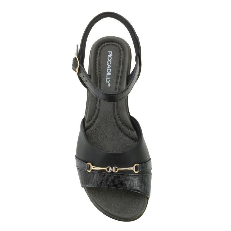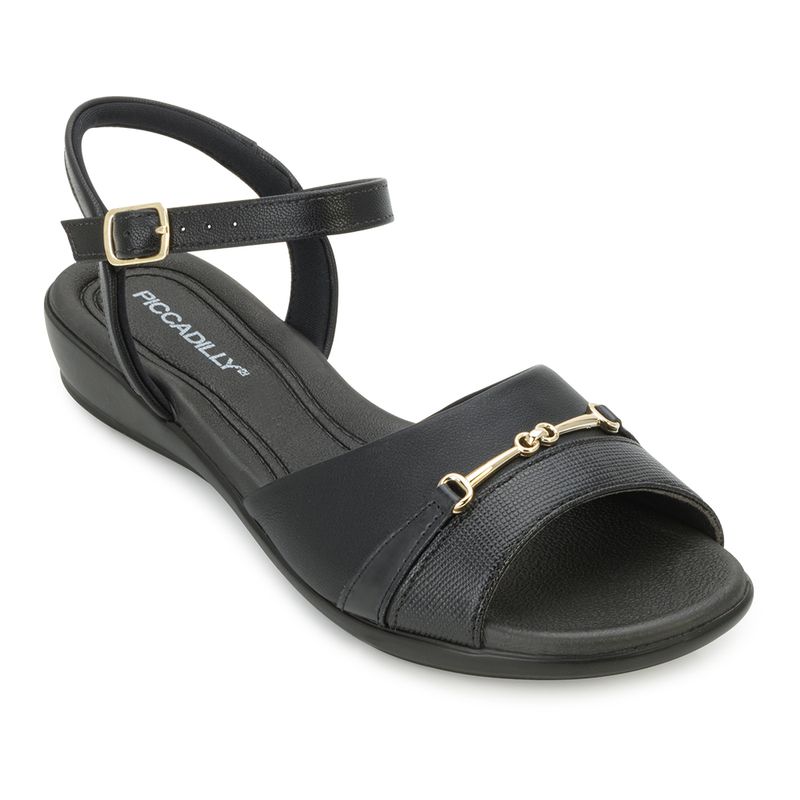 A Sandália Piccadilly é a escolha ideal para quem busca elegância com conforto no dia a dia. Confeccionada em material alternativo com um charmoso detalhe dourado no cabedal, ela traz um toque sofisticado ao visual. Seu interior em tecido acolchoado proporciona uma sensação agradável aos pés, enquanto a palmilha em EVA garante leveza e maciez ao caminhar. O solado em borracha com frisos oferece mais segurança e aderência, e o fechamento por fivela permite um ajuste perfeito. Com salto baixo de 3 cm, é perfeita para acompanhar você em todas as ocasiões com estilo e bem-estar.