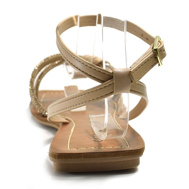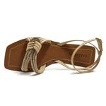 O design se destaca pelo detalhe central de um laço delicado na parte frontal, que é ricamente adornado com aplicações de strass ou micro-pedrarias em tom bronze/champanhe, adicionando um ponto de luz sofisticado ao calçado. As tiras finas garantem sustentação e elegância, com fechamento ajustável por fivela dourada no tornozelo.