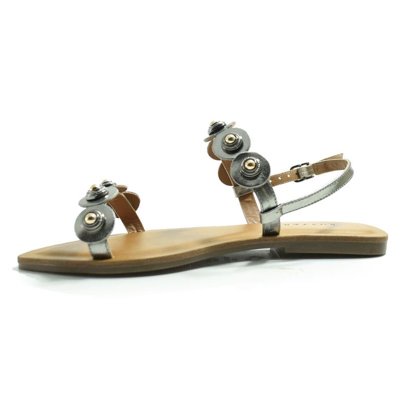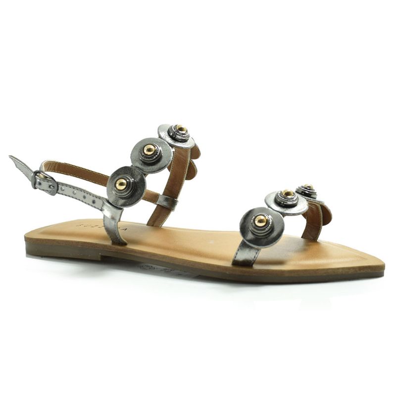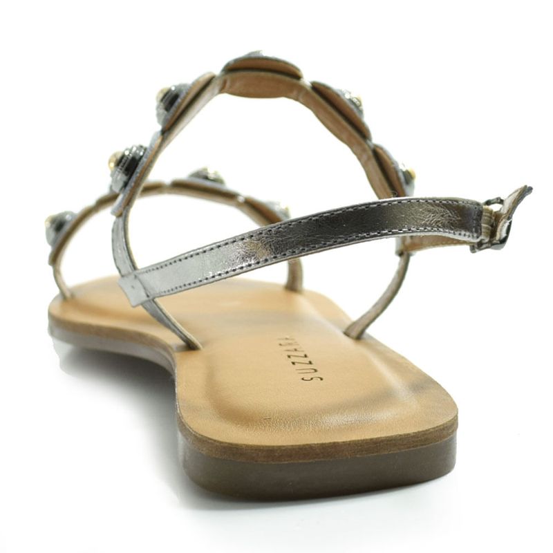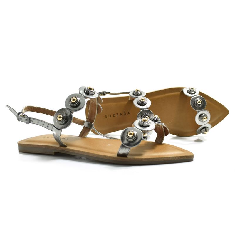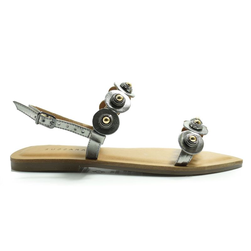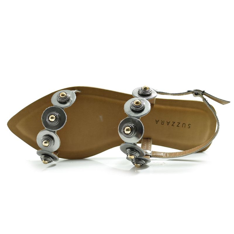 A Sandália Rasteira Feminina Suzzara é uma peça que traduz elegância contemporânea. Seu design com acabamento prateado ganha destaque com delicadas aplicações prateadas circulares, que remetem a pequenas flores modernas e possui um detalhe no centro que reflete a luz de forma sutil. Com um bico alongado e pontudo, confere um visual elegante e atual, valorizando os pés com uma silhueta sofisticada.