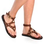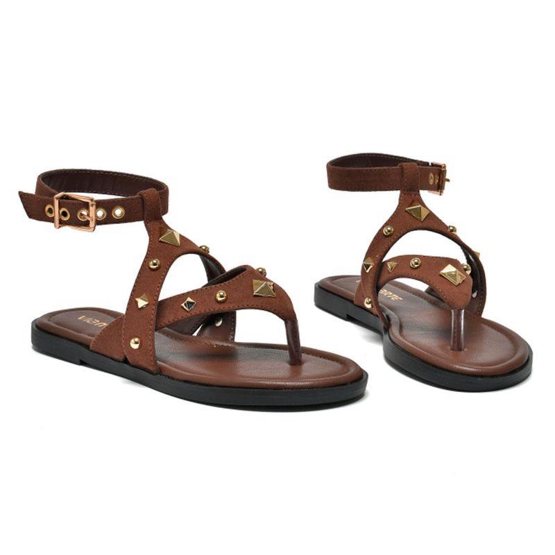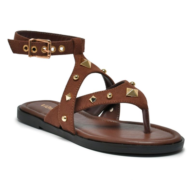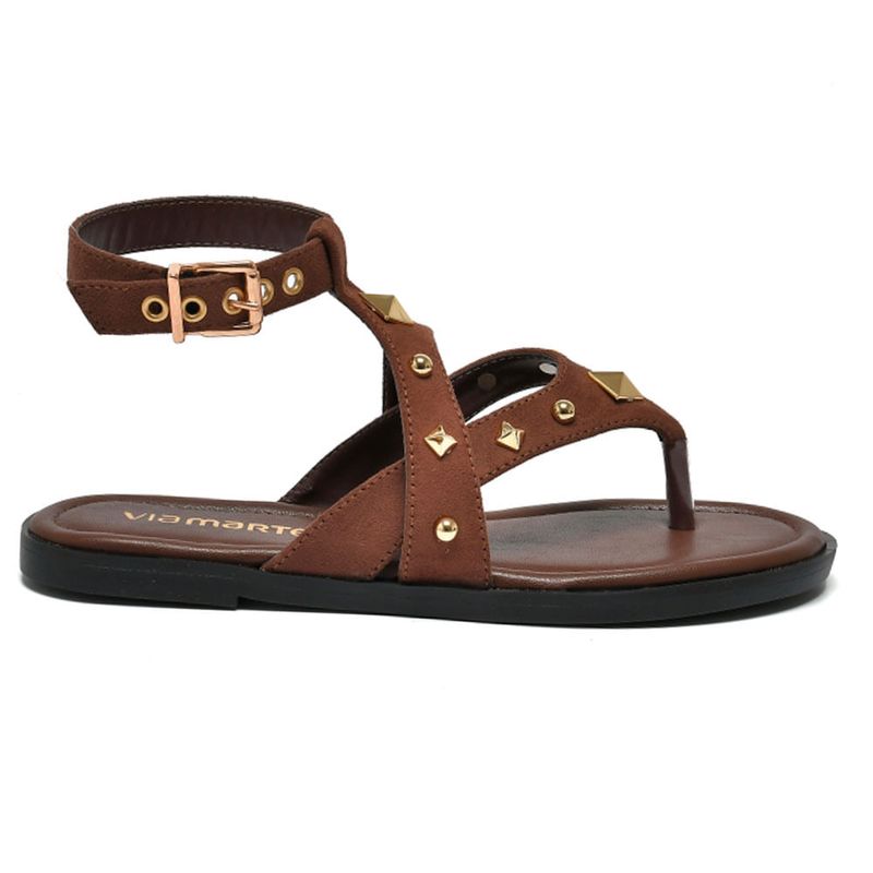Seu design apresenta tiras cruzadas em material sintético marrom, que garantem firmeza e charme ao caminhar. Os apliques metálicos dourados dão um toque de personalidade e tornam o visual ainda mais estiloso. O fechamento lateral por fivela ajustável oferece segurança e melhor ajuste aos pés.