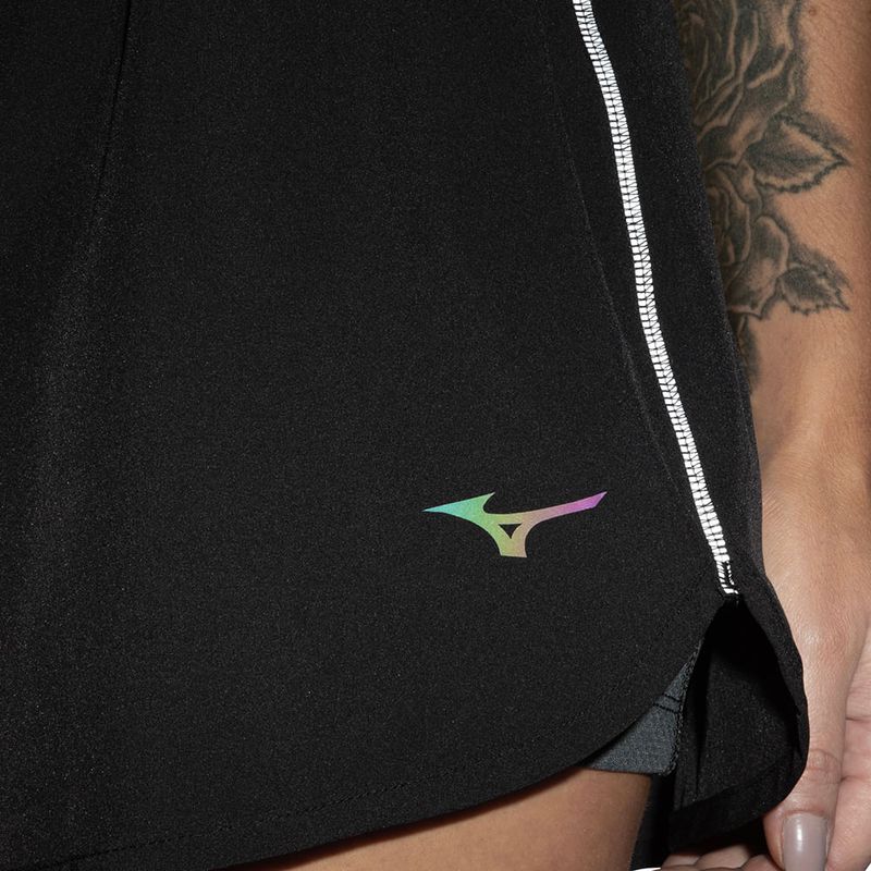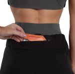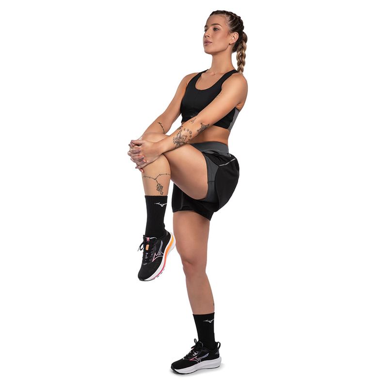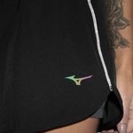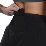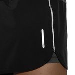 Shorts confeccionado em tecido plano de poliéster com elastano e com bermuda interna e cós em malha. Bolso traseiro com zíper. Costura flatlock com fita refletiva. Logo refletivo.