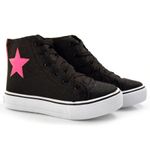 Tênis Infantil Feminino de Cano Alto Ykes, confeccionado em material sintético nas opções de cores preto ou prata brilhante com estrela rosa estampada, perfeito para o dia a dia, passeios, como uma volta no shopping ou almoço em família. Esse tênis é versátil e vai deixar a criançada curtir e brincar a vontade. Aproveite e compre online. Ref: LUREX