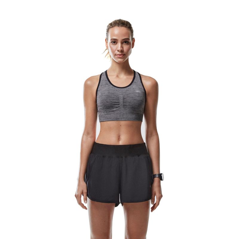 Top feito em malha knit, sem costuras para conforto total sem atrito. Com bojo removível e frente com detalhe modelador para encaixe perfeito no corpo. Frente e costas são duplas proporcionando maior sustentação. Acabamento em viés elástico para mais segurança e conforto nos movimentos. Possui logo e elementos em transfer refletivo para maior segurança nas corridas noturnas. Preto: 60% Poliéster, 32% Poliamida e 8% Elastano. Mescla: 38% Poliéster, 54% Poliamida e 8% Elastano. Seamless: Tecnologia que proporciona um melhor ajuste ao corpo, pois as peças são feitas com o mínimo de costuras possível. Com áreas de respirabilidade e zonas de compressão para aumentar o desempenho. Refletivo: Tecnologia com propriedades refletivas que aumentam a visibilidade, trazendo muito mais segurança para os atletas que praticam esportes em locais com pouca iluminação.