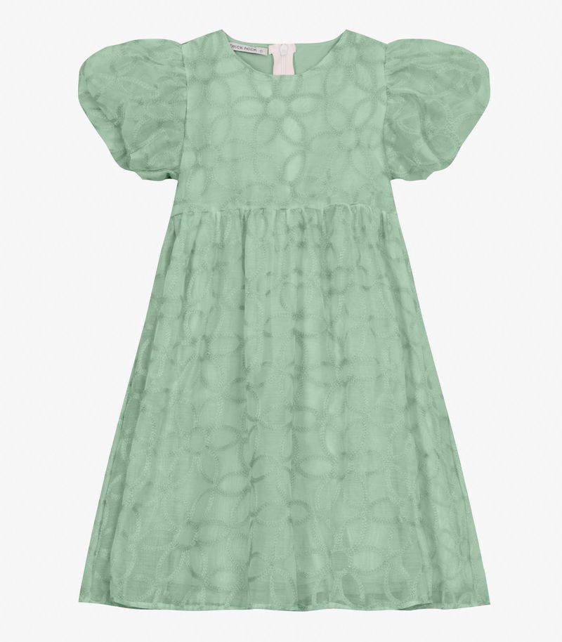 Vestido Infantil Trick Nick confeccionado em Poly Bordado e Viscose Khyara, leve e delicado. Possui babado embutido no forro, com acabamento franzido que dá charme à peça. A cintura também é franzida, trazendo volume e conforto. A barra tem bainha fina que valoriza o caimento. Ideal para ocasiões especiais com muito estilo e conforto