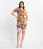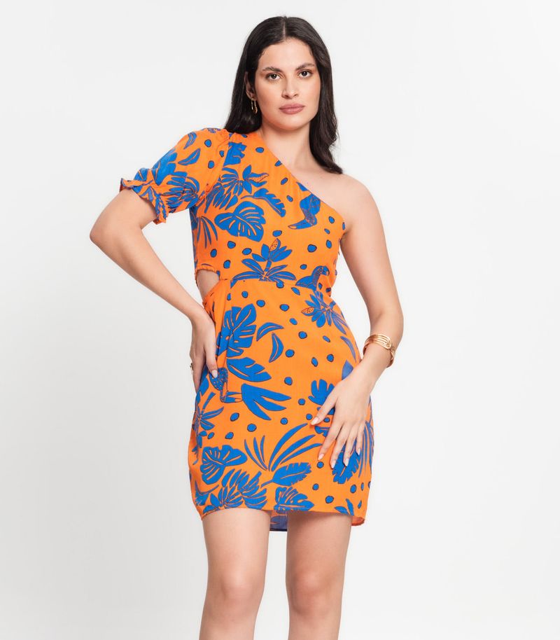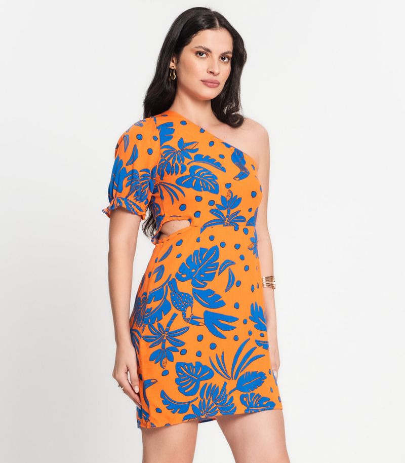 Vestido Feminino Curto Um Ombro Só Select, com estampa de folhagem, fechamento em zíper na lateral e leve abertura na lateral esquerda. Confeccionado em tecido leve e confortável, oferece um visual moderno e elegante, ideal para eventos especiais e festas.