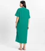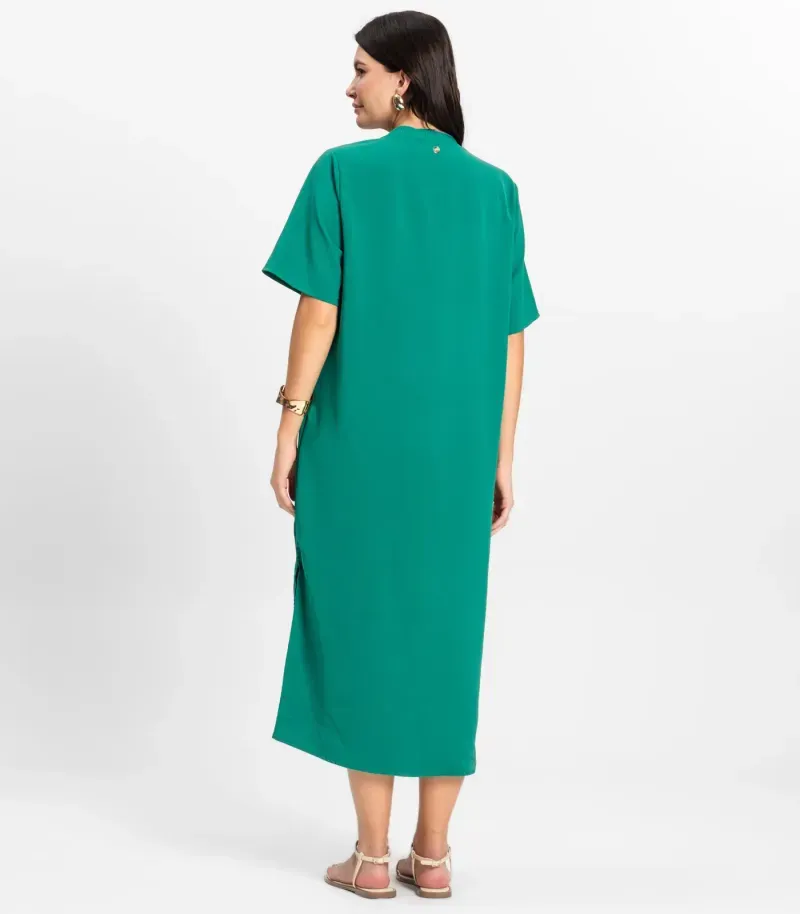 Vestido feminino midi confeccionado em Twill Cey, perfeito para um visual leve e sofisticado. Possui decote com acabamento em retilínea e pesponto aparente, além de bainha estilo lenço nas mangas e barra, trazendo delicadeza ao acabamento. O modelo conta com abertura lateral de um lado só, com acabamento limpo e discreto. Ideal para quem busca conforto com um toque moderno e diferenciado.